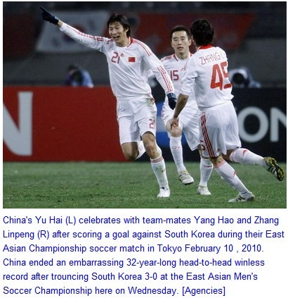 China beat South Korea 3-0 in the East Asian Men's Soccer Championship held in Tokyo, after scoring two goals in the first half and a third one in the second half to bag the biggest margin in all matches between the long-time soccer rivals since 1978.