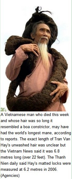 The exact length of Tran Van Hay's unwashed hair was unclear but some estimates put it as long as 6.8 metres.