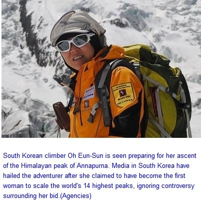 South Korean climber Oh Eun-sun claimed the record as the first woman to summit all 14 of the world's peaks over 8,000 meters when she scaled Mount Annapurna in Nepal on Tuesday.