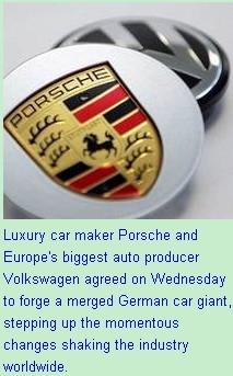 Luxury car maker Porsche and Europe's biggest auto producer Volkswagen agreed on Wednesday to forge a merged German car giant, stepping up the momentous changes shaking the industry worldwide.