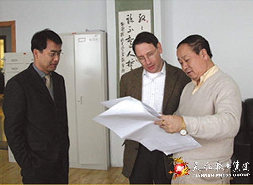 2004年12月21日,国际英语外语教师协会秘书长Evan Frendo(中)参观语文学习报社。